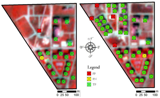 The classification results are presented in Figure 2. The applied methodology accurately detected the buildings in the study area and effectively dealt with small buildings that were barely visible on the satellite imagery. As can be seen from Figure 2, in the image of 2016, one FP and one FN were detected, while 18 buildings were accurately classified. Similar was the case for the image from 2020, where, in addition to the one FN, three FPs were detected and 36 buildings were accurately classified. In addition, a visual inspection of the FP objects was made and it was concluded that the misclassification occurred over road edges and rectangular pools.