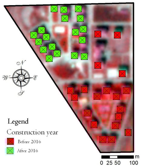 Afterward, the construction year was determined. Since in this paper we aim at determining whether the building was constructed before or after 2016, we used two satellite images, one from 2016 and one from 2020. In Figure 3, the results of the construction year analyses are presented. It was determined that 19 buildings were constructed before 2016, while 18 buildings were constructed after 2016. With the visual inspection of the images, it was concluded that the construction period was accurately determined for all of the buildings in the study area.