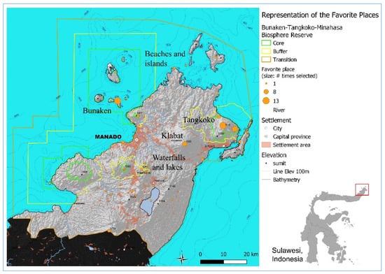 Favorite places and the zoning system of the Bunaken-Tangkoko-Minahasa Biosphere Reserve (BR) (limit of the BR, extracted from nomination dossier—created by the authors).