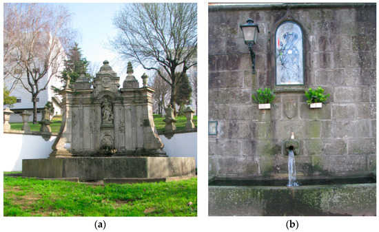 Examples of fountains in Braga, showing elaborated stonework in granite and its presence in the highly developed urban context (a) and association with religious context (b), which is also located in a highly urbanized setting (not visible in the image).