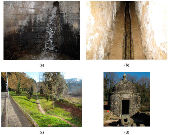 Illustrative images of the seven-fountain water system in Braga (NW Portugal), showing an extensive use of stone for collecting water in underground reservoirs (a), and underground (b) and surface distribution channels (c). The image in (d) shows a detail of the stone pieces used for surface water channels and one of the stations used for the control and manutention of the system known locally as “Mãe d’água” (there have been conservation interventions in these stations, but this older image illustrates the extensive use of stone on these structures).