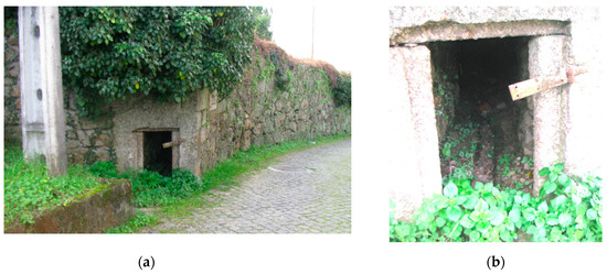 Besides these major water distribution systems, one can also find small structures scattered among human settlements, as illustrated by the water structure shown in Figure 3. Some of them seem to be currently abandoned, but the materials used (stone) and perhaps their position in small settlements have helped to ensure their preservation. There are more modern examples of water systems that were closed and then recovered, such as the Old Croton Aqueduct in New York, which was closed in 1955 and partially reopened in 1987 [8]. There have been cases, such as the so-called “ferrous waters” in Fraião, Braga (NW Portugal), that were dismounted and relocated, keeping the water supply; however, this last case might be illustrative of the problems associated with this, as it seems that the present water supply has very different characteristics from the previous ones, characterized in Lima et al. [9].