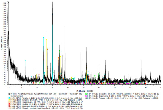 The XRD pattern of the columbite–tantalite concentrate <90 µm (Figure 3) shows the presence of minerals such as xenotime, cassiterite, aluminum silicates of Mn, goethite, and zircon as main impurities associated with the predominant columbite–tantalite (Mn) [12]. These results complement the information obtained by XRF (Table 3), confirming that elements such as Mn and Fe are intrinsically associated with the mineralogy of columbite–tantalite, indeed. Consequently, their physical separation is impossible.