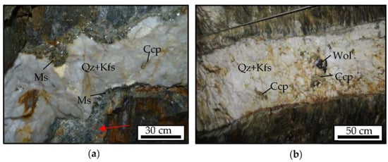 Ore veins in the underground mine of the Buenaventura sector: (a) showing a greissenized selvage (red arrow); (b) showing centimetric wolframite crystals. Ms: muscovite, Qz: quartz, Kfs: K-feldspar, Ccp: chalcopyrite, Wol: Wolframite.