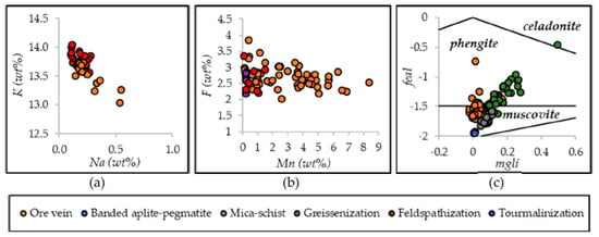 Compositional diagrams of minerals from the ore veins and from the different lithotypes: (a) plot of Na (wt%) vs. K (wt%) for K-feldspars; (b) plot of Mn (wt%) vs. F (wt%) for fluorapatite; (c) white mica composition in the classification diagram for K-micas []. All data from EMP.