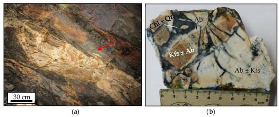 Feldspathized areas in the underground mine of the Buenaventura sector: (a) partly feldspathized mica schist surrounded by a halo of silicification (red arrow); (b) breccia of feldspathized clasts in a cement of chlorite and quartz. Note a later albite-rim around the central clast. Ab: albite, Qz: quartz, Kfs: K-feldspar, Chl: chlorite.