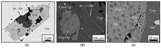 BSE images of the ore paragenesis: (a) inclusions of Nb-Ta-Ti oxides in cassiterite; (b) chalcopyrite with inclusions of other sulfides and cassiterite; (c) the enlarged field of (b) image showing cassiterite partially replaced by the chalcopyrite. Irt-Stv: member of ilmenorutile–strüverite series, Col: columbite, Cst: cassiterite, Ccp: chalcopyrite, Stn: stannite, Sp: sphalerite.