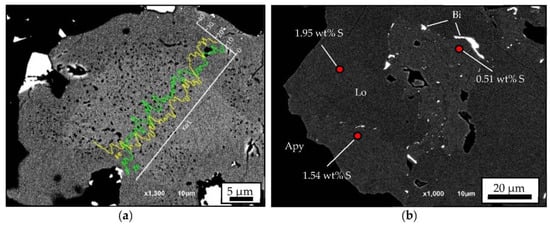 This mineral has löllingite relicts and abundant inclusions of chalcopyrite, pyrrothite, sphalerite, stannite and micrometer-scale native bismuth. In some inclusions, pyrrothite forms aggregates with sphalerite and stannite. The sphalerite has around 10 wt% Fe from SEM-EDS analyses. The löllingite has contents of around 1.5 wt% Ni and up to 0.8 wt% Co, and up to 2.8 wt% S from SEM-EDS analyses. From the BSE images (Figure 7b), it is possible to distinguish a first stage of Ni-Co-bearing löllingite, demarcated by native bismuth inclusions, surrounded by a second stage of S-richer löllingite.
