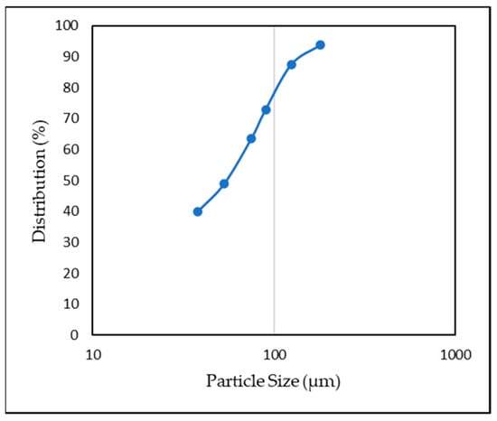 The representative sample was analyzed using the X-ray fluorescence (XRF) technique in order to determine the major and minor elements and oxides. The result of XRF analysis showed that Fe, FeO, S and Al2O3 were the major components, and other oxides such as CaO, MgO and Si2O were the minor components presented in the concentrate sample. The XRF analysis results are presented in Table 1. More than 70% of the original sample was formed from that Fe, Al2O3 and S. Figure 1 shows sample particle size distribution curve. It can be seen in Figure 1, the D80 of the sample was 105 µm.