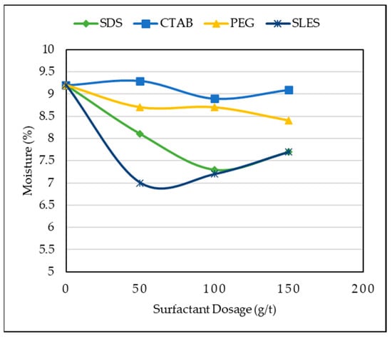 The main mechanism of adsorption of CTAB on magnetite is charge neutralization. This is due to the positive charge of CTAB and the negative charge of the magnetite surface of SDS and PEG surfactants is often bridging. In CTAB, the adsorption mechanism is interaction of electrostatic and neutral loads prevails []. Thus, based on the Figure 2, it can be concluded that surfactants SDS and SLES, by the mentioned mechanism, cause hydrophobicity of particles and, as a result, achieve the lowest moisture content.