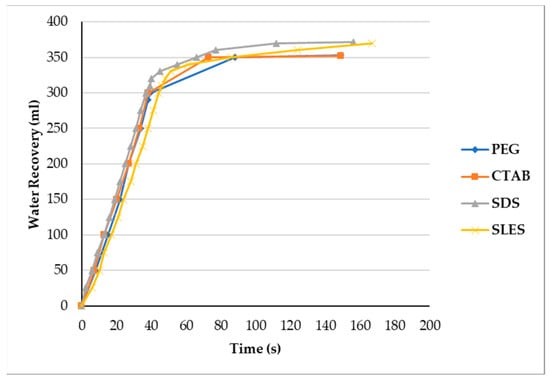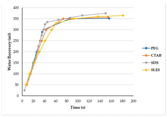 According to Figure 7, the average volumes of water separated at the cake formation in three dosages for PEG, CTAB, SDS and SLES surfactants are 295 mL, 300 mL, 318 mL and 316.5 mL, respectively.