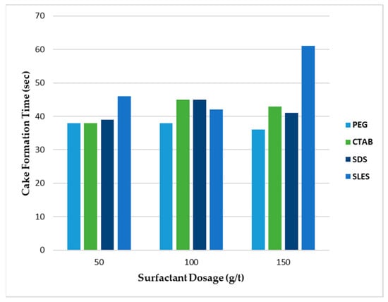 Effect of surfactants on cake formation time at different dosage.