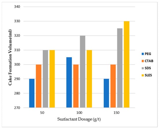 Figure 7 shows the volume of filtrate at the time of cake formation for different doses of surfactants. In the case of no additive, the volume of filtrate was 285 mL. By adding surfactant at all concentrations, the filtrate volume at the moment of cake formation increased. At dose 100 g per ton, the maximum volume was SDS. The highest volumes were 330 and 325 mL for surfactants SLES and SDS, respectively, at a dose of 150 g per ton.
