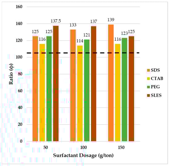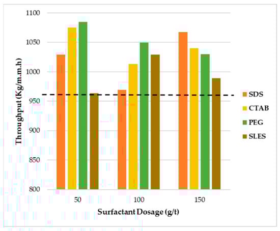 Figure 8 shows the power for surfactants at different concentrations. The amount of throughput without additive was equal to 962 Kg/m2·h, which is marked in the diagram with a dashed line. The maximum throughput was obtained by adding 50 g per ton of PEG. At a dose of 100 g per ton, the throughput for all surfactants had a decreasing trend except SLES. At a concentration of 150 g per ton, the highest throughput was obtained by adding SDS.