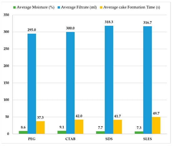 Average values of moisture, filtrate volume and cake formation time for each surfactant.