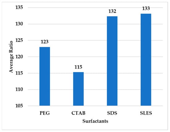 A ratio of throughput to moisture was used to compare the performance of surfactants. Figure 10 shows the ratio of throughput to moisture for different doses of surfactants. Figure 11 shows the average of this ratio for surfactants. According to Figure 11, the average ratio (ϕ) in three dosages for PEG, CTAB, SDS and SLES surfactants are 123, 115, 132 and 133, respectively.