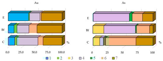 The main forms of gold are water-soluble, bound to organic matter, and “insoluble”. This element was also detected in the form bound to Fe-Mn (hydr-)oxides, but its percentage is insignificant (Figure 1, Appendix A Table A1 and Table A2). The main forms for arsenic are bound to organic matter and to Fe-Mn (hydr-)oxides. The percentage of each form varies in soil horizons, thus, the highest water-soluble gold content is in the E horizon, which is characterized by the less content of absorbing complex and where the percentage of bound to organic matter gold is less; however, this form becomes predominant in the bottom horizon, which is characterized by a low humus content. Arsenic is bound preferably to organic matter in the E horizon, and the percentage of that form is less in the bottom horizon where the form bound to Fe-Mn (hydr-)oxides predominates. The highest “insoluble” form percentage for gold is in the illuvial horizon, whereas for arsenic it is less; for this element, the highest percentage of that form is in the C horizon.