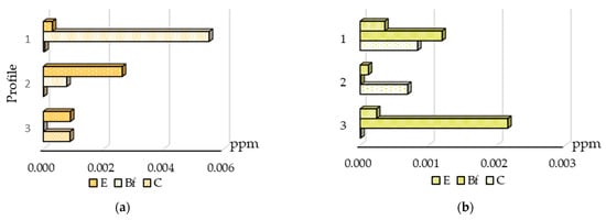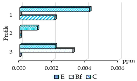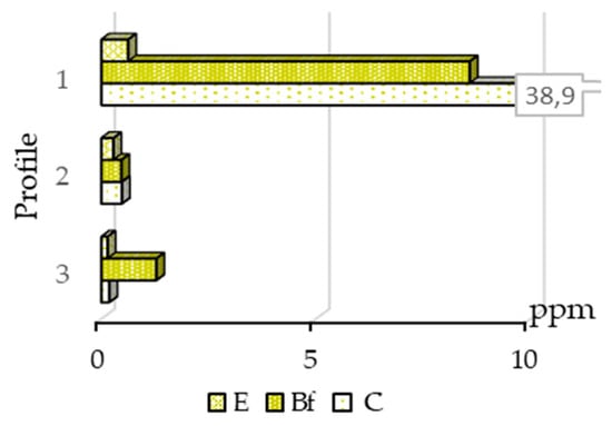 The distribution of gold and arsenic bound to organic matter has different tendencies (Figure 3); gold concentrates mostly in the C horizon and its content increases from profile No. 1 to profile No. 3, which does not point to the mineralized zone; arsenic preferably concentrates in the BF horizon and its content increases from profile No. 3 to No. 1 and the highest arsenic content is in C horizon over the mineralized zone. Thus, this makes it possible to conclude that gold bound to organic matter does not point to the mineralized zone, despite it being one of the main forms of this element in the soil in the Novye Peski area.