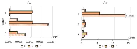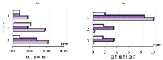 The distribution of gold and arsenic bound to Fe-Mn (hydr-)oxides is presented in Figure 4. For gold, this form is not the main one, but we consider it for comparison with arsenic distribution. Gold concentrates mainly in the C horizon and its highest content is in this horizon of profile No. 2. Thus, analyzing the gold bound to Fe-Mn (hydr-)oxides in C horizon does not point to the mineralized zone, but there is some increase of this element content in the BF horizon in profiles No. 1 and No. 2 against No. 3 profile over barren rock. Arsenic concentrates in horizon BF, where the iron and manganese oxides and hydroxides accumulate in the highest degree within the podzol soil profiles. The highest arsenic contents are in BF and C horizons of profile No. 1, over the mineralized zone.