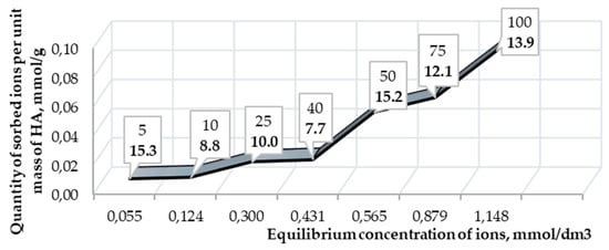 Equilibrium Concentration of Ions, mmol/dm3Quantity of Adsorbed Ions Per Unit Mass of HA, mmol/gAs Recovery Rate from Solution, %