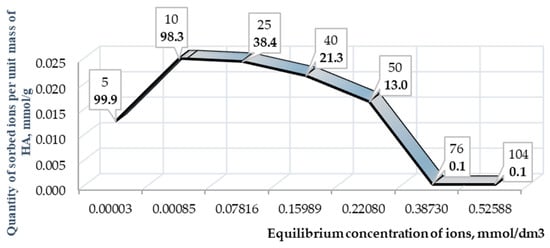 Figure 7. Isotherm of arsenic ions sorption on HA. The footnotes indicate the initial concentrations of the element in solutions and recovery rate (in bold type).