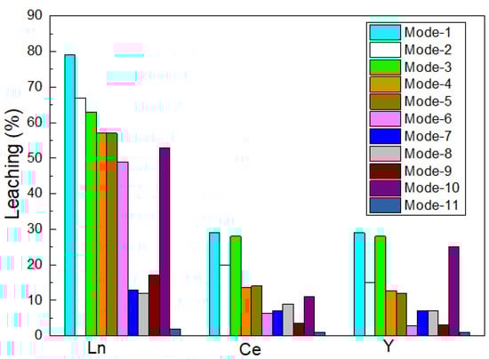 An insignificant leaching of metal in leaching mode 7 (13% Y, 7% Ln, and 7% Ce), mode 8 (12% Y, 9% Ln, and 7% Ce), and mode 9 (17% Y, 3.5% Ln, and 3% Ce) was observed due to an incomplete hydrolysis of saw dust as the substrate.