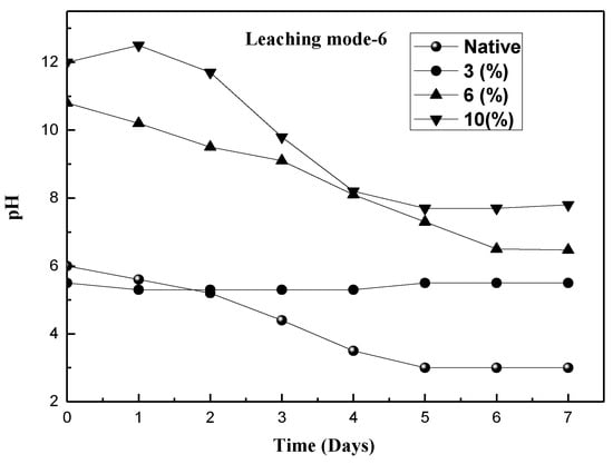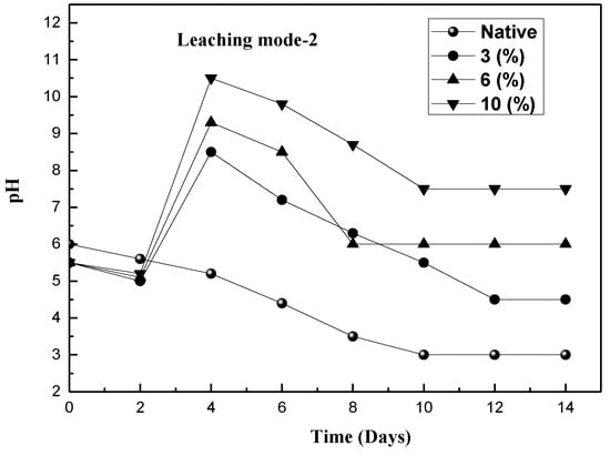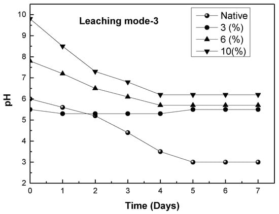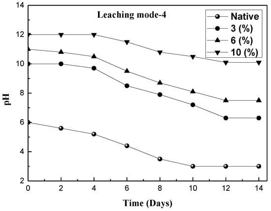 Figure 2, Figure 3, Figure 4, Figure 5, Figure 6 and Figure 7 show the changes in the pH profile with various pulp densities in various leaching modes using glucose and molasses as the substrate. With an increasing pulp density, a slow decrease in pH was observed in all leaching modes. This may be due to the higher toxicity of metals ions at higher pulp densities, limiting the microbial metabolic activities by inactivating the enzymes. At 6% or a higher pulp density, the pH value increased at the beginning of bioleaching, before the strain grew abundantly. This may be due to the continual dissolution of substantial alkaline minerals in red mud taking more time to reach chemical equilibrium under laboratory conditions [,,].