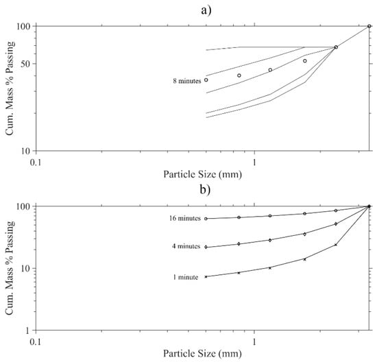The experimental PSDs of the −3.35 + 2.36 mm clinker ground in the ball mill for different times, and the corresponding PSDs simulated with non-random particle selection through Power (a) and Mass and Power (b) probability vectors. The simulated PSDs are shown with straight lines, while the experimental PSDs are shown with symbols. Ball size in experimental tests = 31.75 mm, n exponent in the ‘MP’ probability vector ranges between −4.0 and −3.5.