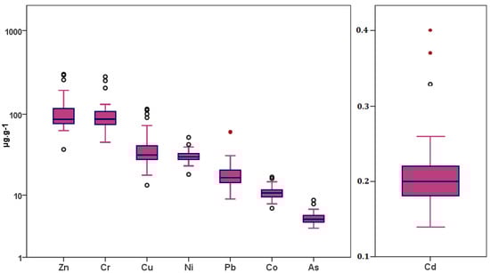 Box plot of the TE concentrations in bottom sediments from the Sebou basin. Notice that concentrations are expressed in log, except for Cd.