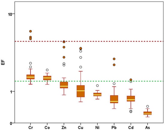 The assessment of trace metal concentrations in sediments is necessary, but it is not a sufficient way to identify the contamination level and origin [25,26]. Many authors have used the enrichment factor, Equation (1) [26], as an indicator of the anthropogenic contribution of trace metal concentrations [5,27,28].