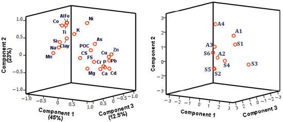 Principal component analysis (PCA) was performed on the average concentrations of trace metals and major elements, with some key parameters (clay, fine silt (FS), coarse silt (CS), and POC content) in the sediments, to identify the controlling factors (Figure 4).
