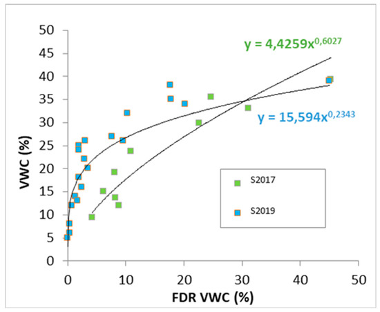 The FDR calibration curve was obtained by plotting each value of the soil moisture content provided by the FDR sensor against the corresponding volumetric water content (VWC) of the sample. In total, 18 FDR measurements were collected for S2017 and 20 for S2019. For each reading the VWC has been derived as: