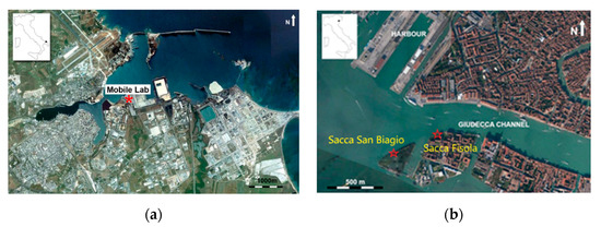 In Venice, the tourist harbour, namely Stazione Marittima, is separated from commercial piers, located at Porto Marghera within the large industrial area of Venice. The Venice Terminal Passenger, positioned at the corner of the Giudecca Canal, which is devoted to local ferries and catamarans, can host the largest cruise ships (with 5 km of quayside and 10 multifunctional passenger terminals). In 2018, 1.6 million cruise passengers transited there, designating Venice as one of the main Mediterranean homeports (https://www.port.venice.it/, accessed on 12 June 2021). Here, the sampling site was on the Sacca San Biagio island (45°25′38.50″ N–12°18′33.86″ E, 1 km south of the passenger terminal) during the first campaigns (2007, 2009 and 2012), while it was on the neighbouring Sacca Fisola island (45°25′42″ N–12°18′46″ E, 500 m from the location of ships at berth) for the last 2018 campaign.