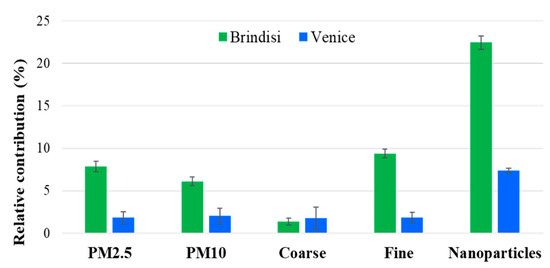 The general trend of relative contribution was the same at both sites with larger values for nanoparticles, followed by fine and coarse particles’ ranges (Figure 2). The relative shipping impact on nanoparticles was 7.4 ± 0.3% in Venice and 26 ± 1% in Brindisi; smaller contributions were found for number particle concentrations in the fine and coarse ranges (1.9% and 1.7% in Venice, and 9.4% and 1.4% in Brindisi, respectively). Results were larger in Brindisi for all size ranges, likely as a consequence of the distance from the docks (lower in Brindisi compared to Venice) and of the greater internal harbour vehicular traffic and the absence of local mitigation measures as in Venice. The smaller distance from the docks in Brindisi site is an important aspect because the contribution of shipping emissions to air quality quickly decreases with distance from the harbour [14]. As reported, standard metrics for mass concentrations (i.e., PM10 and PM2.5) have comparable contributions. In fact, the impact to PM2.5 represented about 84% and 81% of that to PM10 in Brindisi and Venice, respectively [11,15]. This happens because ship exhaust emissions are in the ultrafine range, as observed in several studies [11,12,16,17,18,19,20]. Definitively, this evidence supports the idea that particle number concentration, in nanoparticle or ultrafine size range, could be a better metric, compared to standard ones, to investigate the impact of shipping to local air quality.
