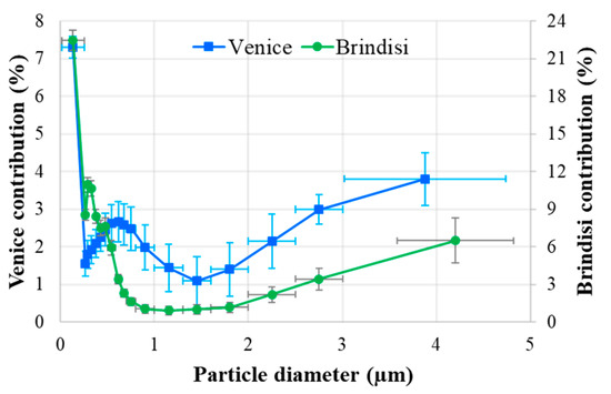 A characterisation and comparison of the size distribution of shipping impact is reported for both port-cities (Figure 3). Results obtained showed general similarities and some different details between them. After a maximum for nanoparticles, a quick decrease and a secondary maximum in the fine range were recorded. The secondary maximum was in the range 0.3–0.45 µm in Brindisi and between 0.4 and 0.7 µm in Venice, being 2–3 times lower than the absolute maximum. For larger diameters, the relative contribution reached a minimum in the size range 1–1.5 µm, followed by a noticeable growth in the coarse size range for both sites.