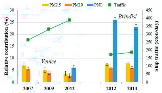 Relative contribution of particles’ concentration in previous campaigns in Venice and Brindisi, with indication of ship traffic volume [21,23]. Results for PM10 from indirect calculation were obtained considering a ratio PM2.5/PM10 equal to 0.78.