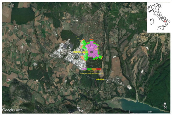For regulated pollutants, time series analysis showed general compliance with the limits set for by the existing national [32] and European legislation [5]. It is worth noting that, for the sole Agri Valley, a regional law [33] identifies limit values more stringent than those in force at the national level for SO2 and H2S that are considered proxies of local hydrocarbon emissive processes. This law sets at 280 μg/m3 and 100 μg/m3 the hourly and daily limit values for the protection of human health for SO2, and 32 μg/m3 the daily limit for H2S. The hourly limit value for SO2 rarely exceeded these limits and each time in different years. As far as the climate is concerned, the cold and rainy winters as well as cool summers with frequent rainfall [34], typically registered in the area, define an area at sub-continental climate. Based on the analysis of wind data, the mean value of ws was 1.8 ms−1, with the higher values generally measured during daytime. The wind rose, superimposed on the map in Figure 1, showed a prevailing wind direction from the SW to NW sector, over the period ranging between January 2013 and December 2019.