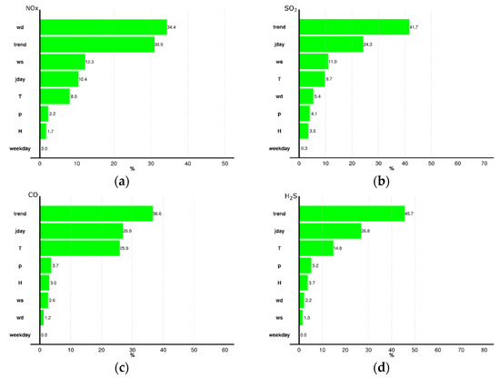 Relative importance of predictors for the selected pollutants: (a) NOx, (b) SO2, (c) CO, and (d) H2S.