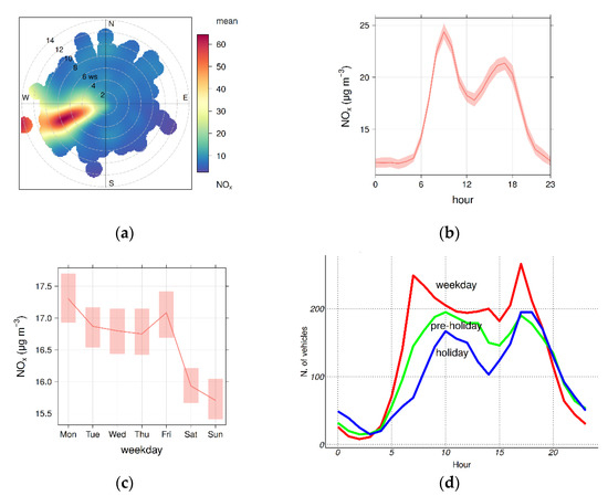 The most important contributing factor to NOx variability, instead, was the wind direction, closely followed by trend, and to a lesser extent, ws and Jday. It is worth examining more closely the dependence of NOx from wd. The bivariate polar plot (Figure 3a) confirmed the strong directionality of NOx concentrations associated with winds from WSW, that is, in the direction of both several of the COVA plant conveyed emissive sources and the SS598 national road. The hypothesis of a traffic contribution to NOx was supported by the analysis of the daily and weekly NOx pattern (Figure 3b,c). The former tends to be significantly bimodal (higher concentrations in the early morning and late afternoon coinciding with the commuting hours). The latter shows a clear decrease in NOx concentrations on Saturday and Sunday when traffic is usually lower. Both these patterns were also confirmed by the analysis of the metadata concerning the traffic flows of cars and heavy vehicles for the national road SS598 provided by ANAS for the year 2019 (Figure 3d).