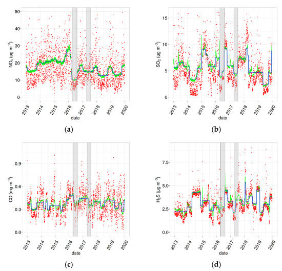 Daily averages of observed (red dots) and meteorologically normalised concentrations (green lines) of (a) NOx, (b) SO2, (c) CO, and (d) H2S. The blue solid line represents the line joining the wbs change points, while the grey areas show the periods of COVA plant shutdowns.