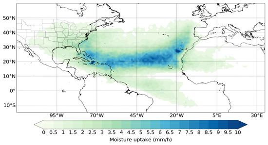 The moisture uptake composite from 0000 UTC 30 August to 1200 UTC 13 September reveals the moisture sources for Hurricane Irma (2017) genesis and intensification. Clearly, from Figure 1 we identified the eastern North Atlantic along the northwest coast of Africa, from the Iberian Peninsula to the genesis position, and the Sahel region, as the main moisture sources that favoured the activation of the convection when Irma was still a tropical disturbance embedded in an easterly wave [14]. The circulation of the North Atlantic Subtropical High-Pressure system (NASH) and the easterly winds acted as moisture transport mechanisms from the source regions to the genesis location.