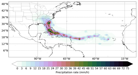 After the hurricane reached its maximum intensity close to the islands north of the Lesser Antilles Arc, the precipitation intensity increased to a maximum higher than 36 mm/h during its movement north of Cuba, as shown in Figure 2. At this time, the higher precipitation rates were located in the northeast (NE) quadrant of the storm, coinciding with the regions with the highest moisture uptake, as can be easily verified in Figure 1 and Figure 2.
