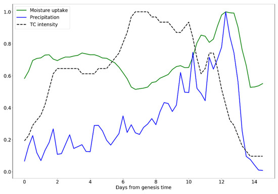 From Figure 3 it can be inferred that in the eight days after the Irma genesis, the moisture uptake was higher than the precipitation rate, which favoured the continuous release of latent heat, a key factor in the intensification of TCs in agreement with Emanuel [20]. Nevertheless, in the last five days (from day 9 to day 14) of Irma as a TC, the moisture uptake and the rain rate temporal evolution was very similar, which corresponds to the high accumulated rainfall during its movement along the north coast of Cuba and the Florida peninsula. It is notable that both magnitudes reach their maximum values at this time.