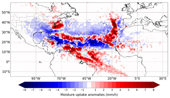 As expected, the moisture supplied from the surface under the area delimited by hurricane size is small, thus, the water vapour supplied from the environment through the secondary circulation transported more moisture inward. The accumulated moisture uptake anomalies along Hurricane Irma’s trajectory showed that both the Tropical North and South Atlantic Oceans were important sources of moisture for Irma development. However, the region of West Africa and the North Atlantic Ocean near the African continent and the Iberian Peninsula also provided humidity.