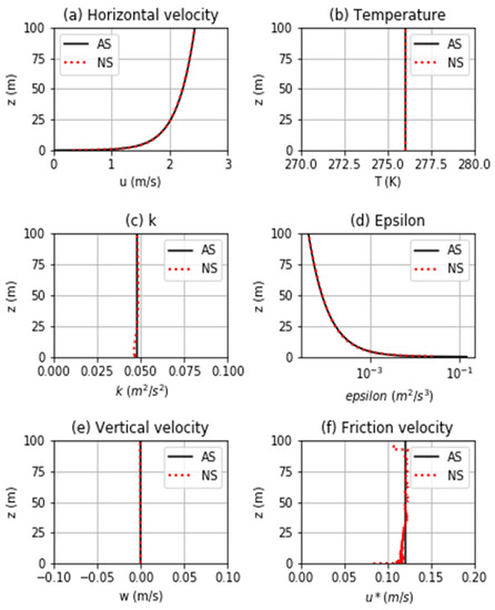 Comparison of the numerical solution (NS) with the analytic solution (AS) for the neutral atmosphere. (a) horizontal velocity; (b) potential temperature; (c) turbulent kinetic energy; (d) turbulence dissipation rate; (e) vertical velocity; (f) friction velocity. The numerical results are shown for a position 2000 m from the upwind boundary of the domain.