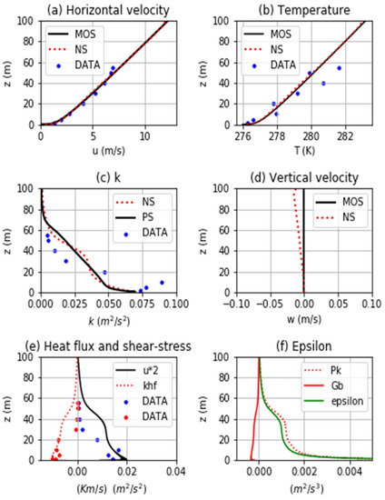 Figure 2 shows the results for the SBL. It can be seen that reasonable agreement was found between the measured values of velocity and θ, and the respective profiles obtained from MOS; although the vertical structure of θ was more complex than the derived MOS profile. The numerical results compare well with the MOS profiles for horizontal velocity and θ in Figure 2a,b, respectively. In addition, k matches its reference profile reasonably well in Figure 2c. At equilibrium, turbulence production and destruction should be in balance, i.e., ε = Pk + Gb, and it can be seen in Figure 2f that the vertical profile of ε follows closely the production/destruction rates of k, indicating that equilibrium was attained. In summary, the numerical results were generally able to replicate the profiles derived from MOS based on the surface flux data.