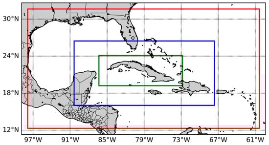- Sierra-Lorenzo, M.; Ferrer-Hernández, A.L.; Hernández-Valdés, R.; González-Mayor, Y.; Cruz-Rodríguez, R.C.; Borrajero-Montejo, I.; Rodríguez-Genó, C. Sistema Automático de Predicción a Mesoescala de Cuatro Ciclos Diarios; Technical Report; Instituto de Meteorología de Cuba: La Habana, Cuba, 2014. [Google Scholar]