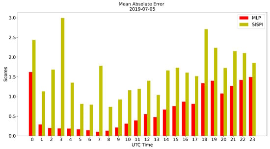 Mean absolute error of the SisPI forecast for 5 July 2019 and the SisPI forecast after bias correction with the MLP model.