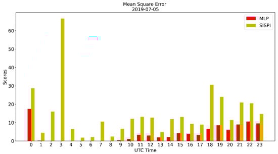 Mean square error of the SisPI forecast for 5 July 2019 and the SisPI forecast after bias correction with the MLP model.