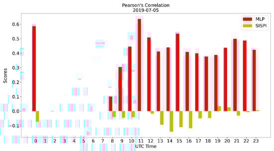 Pearson’s correlation of the SisPI forecast for 5 July 2019 and the SisPI forecast after bias correction with the MLP model.